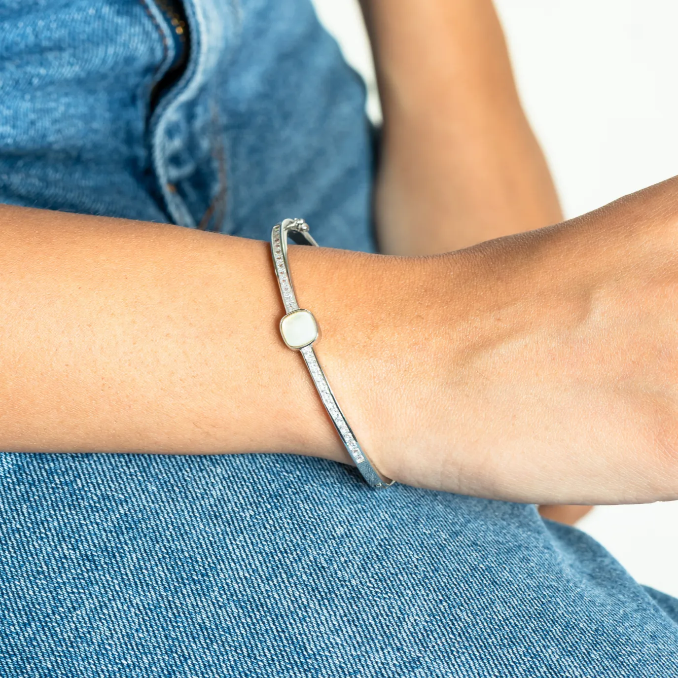 Sleek silver bracelet with a single sparkling gemstone. Minimalist and versatile, suitable for casual or special occasions.