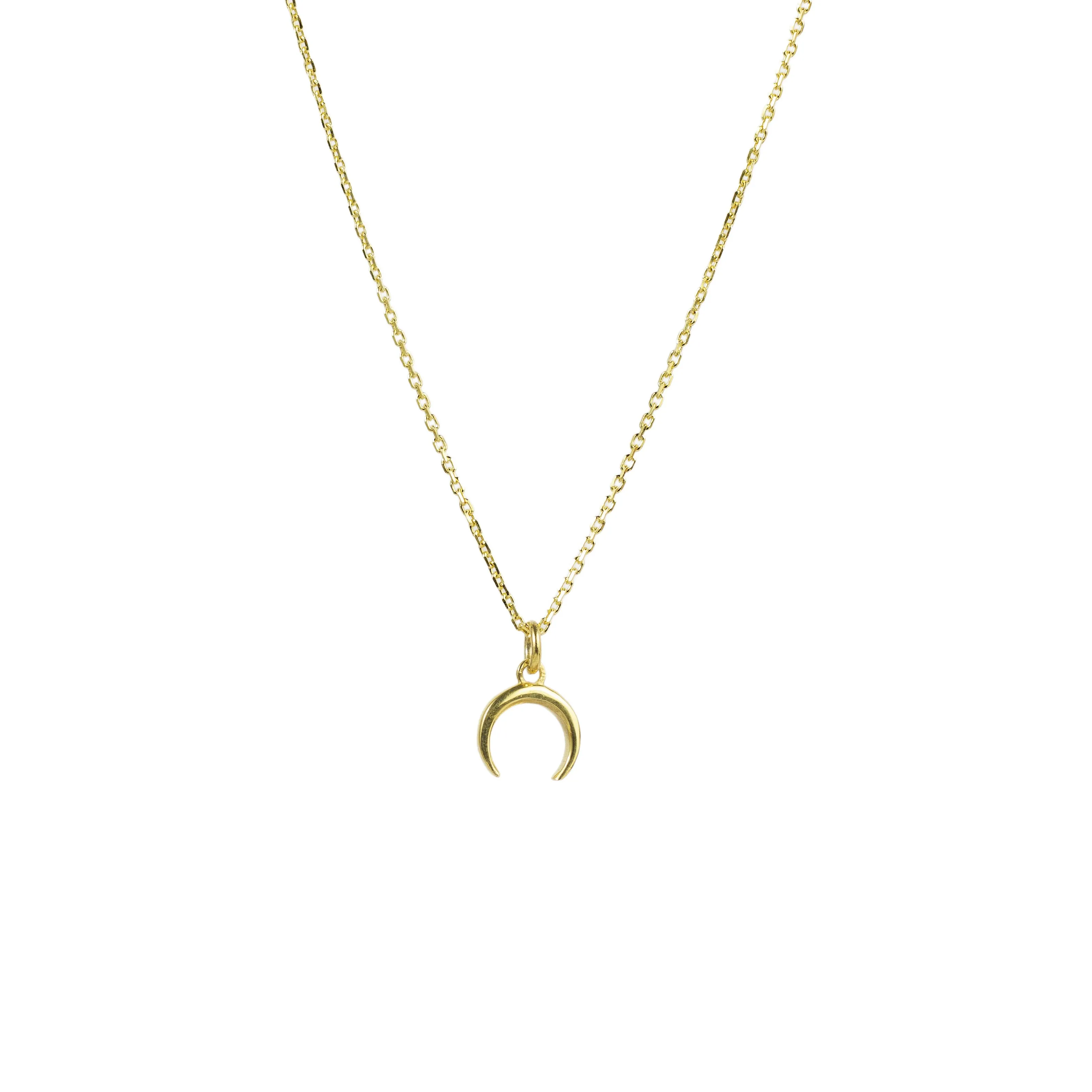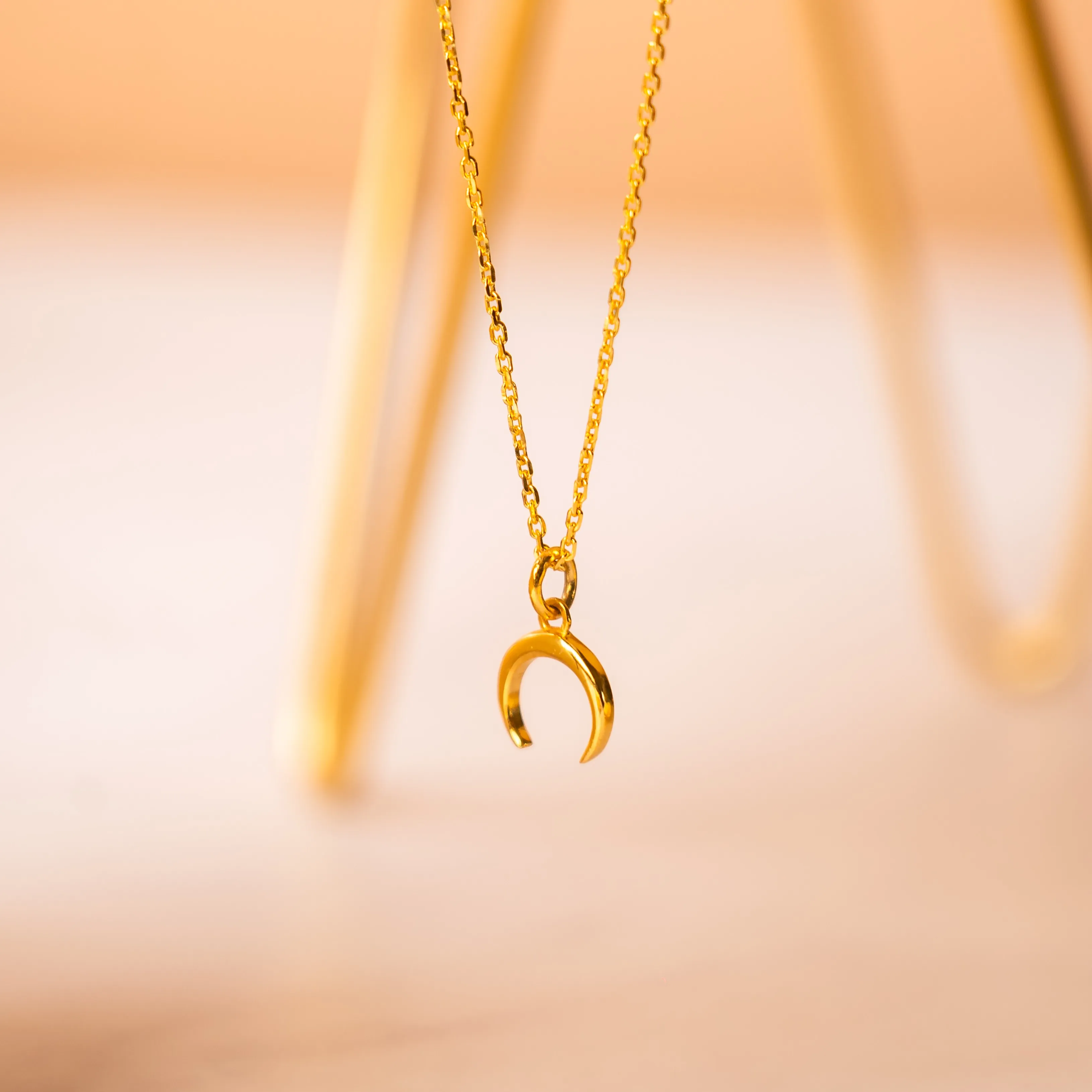 Graceful crescent pendant on a gold chain, channeling lunar tranquility.